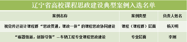10月22日,辽宁省教育厅公布了2025年辽宁省高校课程思政建设项目遴选结果,确定了辽宁省课程思政建设先行高校10所、课程思政建设先行高校(培育)20所、课程思政建设试点院系47个、课程思政建设典型案例100项。我校获批“辽宁省课程思政建设先行高校”,成为全省10所首批获此殊荣的高校之一。文化传媒与艺术设计学院获批“辽宁省高校课程思政建设试点院系”,《视觉传达设计课程群“思政贯通,课政一体”的课程思政协同建设》与《“砺器悟道,创新引领”——车辆工程专业课程思政建设》2项案例入选“辽宁省高校课程思政建设典型案例”。